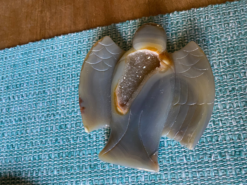 🌟 Angelic Agate Creations: These exquisite angels feature sparkly geode openings/ their micro-crystal sparkles enhancing their ethereal beauty. The wings bear lovely markings, and their detailed gowns exude elegance. Let’s explore the metaphysical magic of Agate—the stone that infuses these celestial beings with strength, harmony, and protection. 🌿