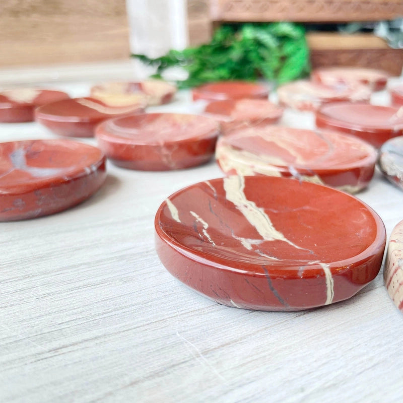 🔴 These small bowls are carved from natural red brecciated jasper, showcasing bright red tones with cream, black, and white variations that feel alive with earthy character. 🧱 Each little bowl is like a tiny vessel of strength and stability, echoing the grounding energy many associate with red jasper.