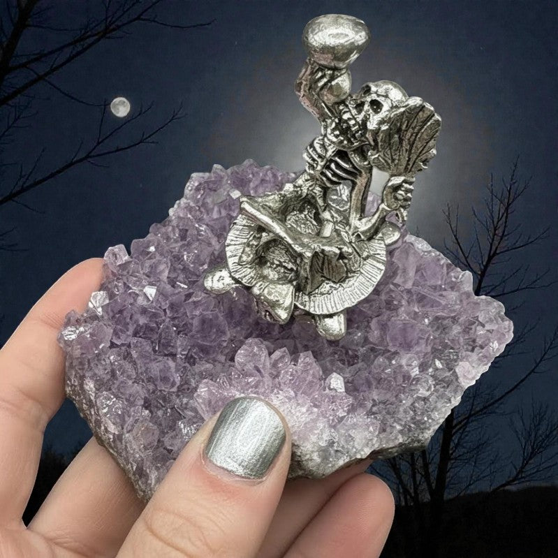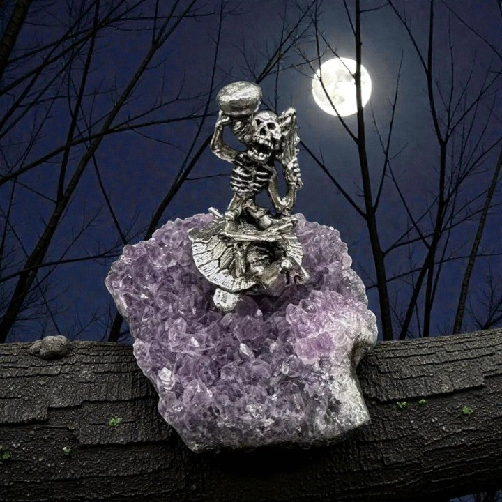 💀🐢 This quirky and unique piece features a silver tone metal skeleton perched atop a natural amethyst cluster, securely mounted and full of intriguing character. 🪶