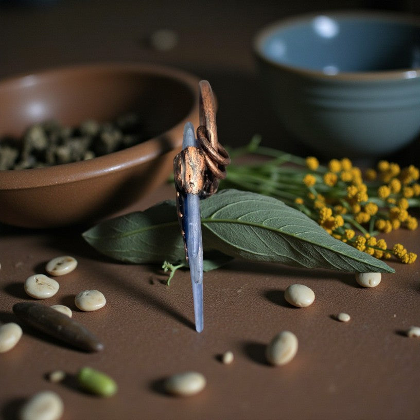 🌙 Many wear Kyanite to assist with communication and calm, letting its high vibration dissolve energetic blockages. 🔮 Pair it with grounding stones for balance or wear it alone to attune your aura to peace and purpose. 🌻 A unique amulet that unites sun fire and sky spirit, it invites clarity, courage, and renewal. 🌟