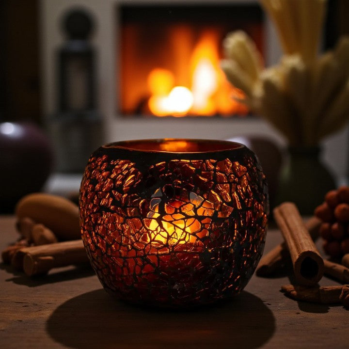 🕯️🪨 This deep brown glass mosaic votive holder brings an ember-warm, grounded glow that feels like earth meeting fire in sacred balance.