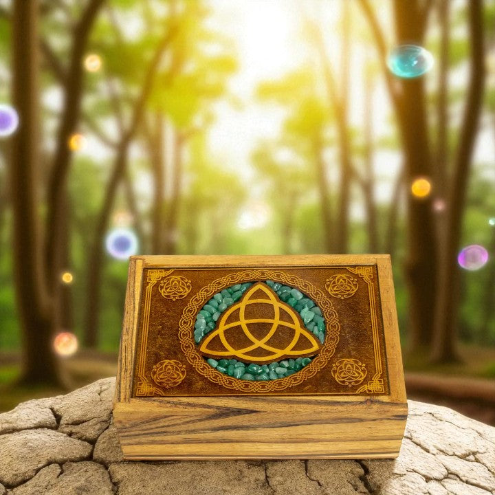 🍀Aventurine is cherished as a stone of luck and heart-centered optimism, inviting gentle growth and fresh opportunities. 💚 Its calming green frequency is believed to balance the heart chakra and soften anxious edges. 🔮The triquetra is often seen as a protective sigil, weaving mind, body, and spirit into harmonious alignment.