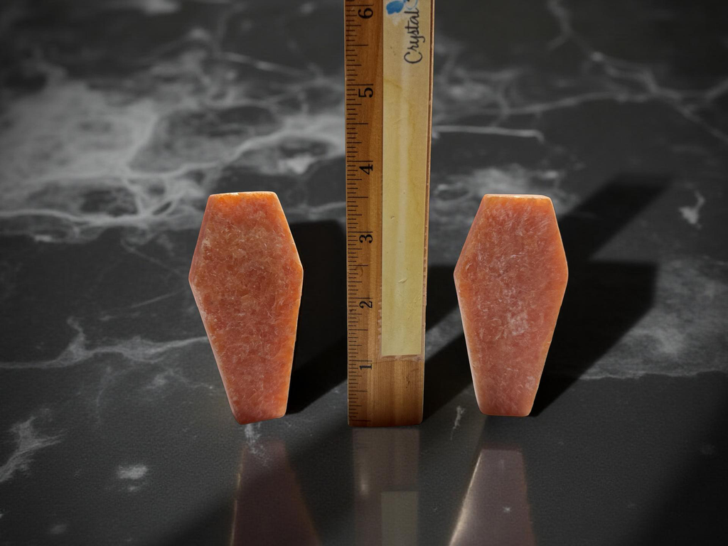 🧡 These coffin-shaped carvings are hand-carved from rich orange sunstone and measure approximately 4" long with a substantial ½" thickness 🔥 Their bold shape and vibrant hue make them a standout piece for any crystal collection or seasonal display 🎃 Sunstone is known for its uplifting energy and radiant metaphysical properties, making these carvings both visually striking and energetically powerful ✨