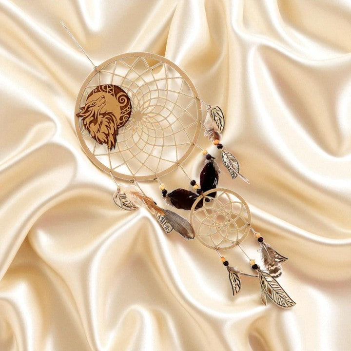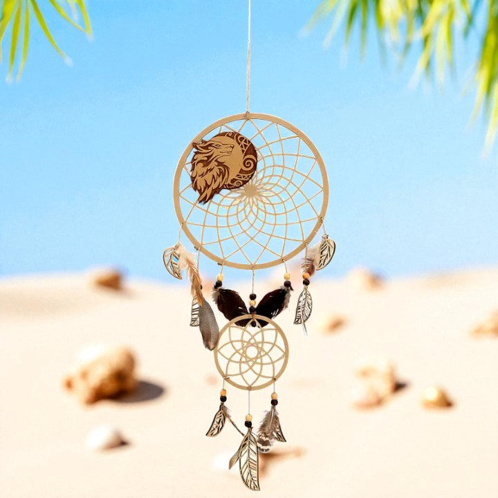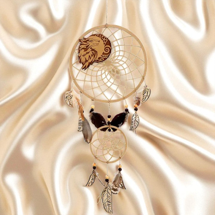 🐺✨Laser-cut wooden dreamcatcher featuring a noble wolf with beads and feathers invites protective guidance and intuitive strength. 🌙The woven web is believed to filter heavy dreams so only the gentle visions pass through.
