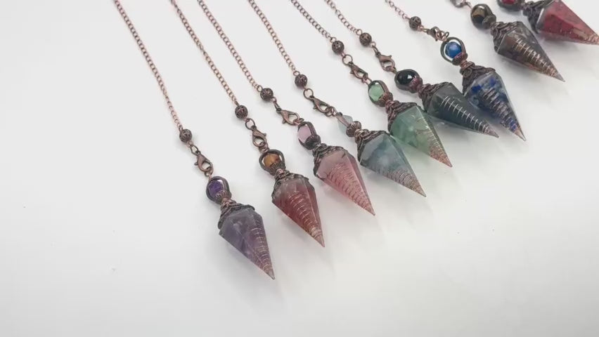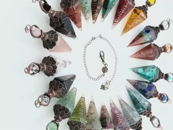 💧 These gemstone pendulums feature all-natural gemstone chips and fine copper encased together within shimmering orgonite resin. 🌊 The piece also includes a hand-wrapped copper wire element, uniting beauty with energetic conductivity. 🔗 A silver-plated chain with a lobster clasp offers easy wear as a necklace or tool for practice.