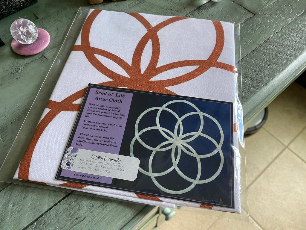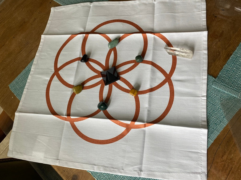 This is a Sacred Geometry pattern called the Seed of Life centered on white cloth measuring 18" by 18" that can be used as a base for arranging your crystals into a grid of you choosing.