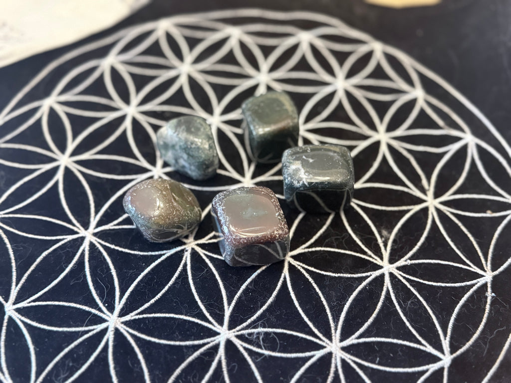 ✨ Explore the enchanting beauty of Moss Agate Cubes, a stunning representation of sacred geometry 🌿 Hand-carved and polished, each cube showcases unique colors and patterns, making every piece truly one-of-a-kind 💚 The natural inclusions and variations in size add to their charm, inviting you to connect with their earthy energy 🌌