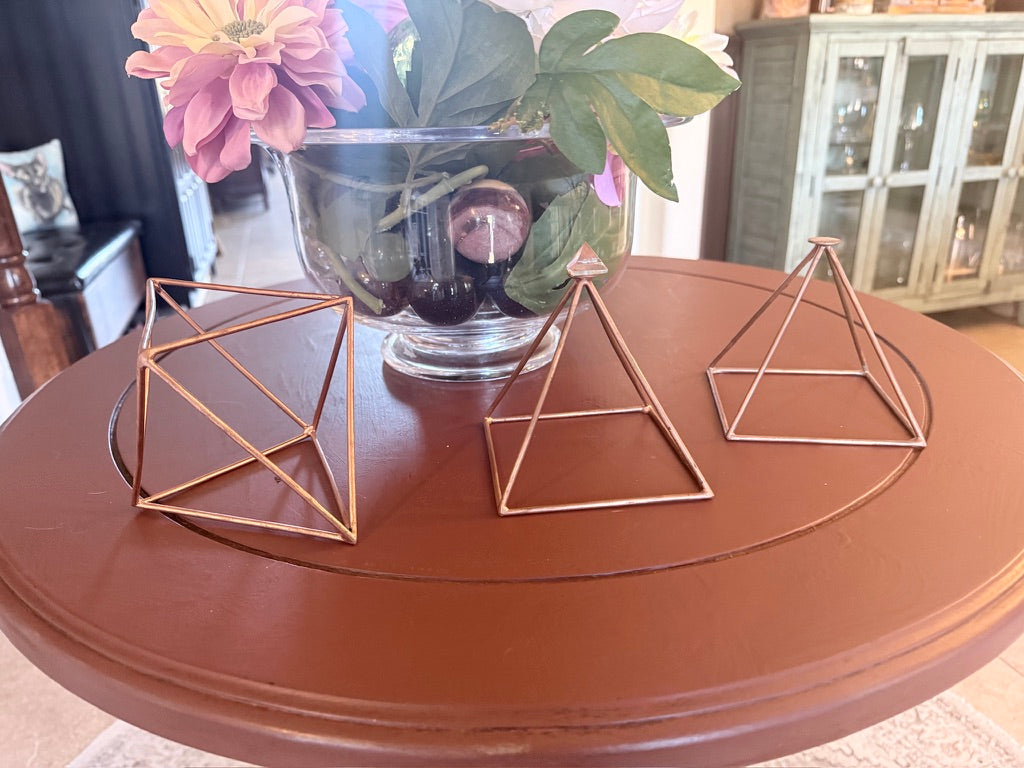 Copper is an excellent energy conductor and when used with other stones and crystals it aids in the alignment of each stone’s individual energy fields and individual properties. By doing this, it enhances the properties of any crystals in and/or around it. Not only does the copper have an effect on your crystals, but the pyramid shape does also. If you create a crystal grid on a sacred geometry tile while under the pyramid, that creates a union between the crystals, the Pyramid and the Copper itself. Excellent for manifestation of the intent of your crystal grids and for giving all your crystals a boost.
